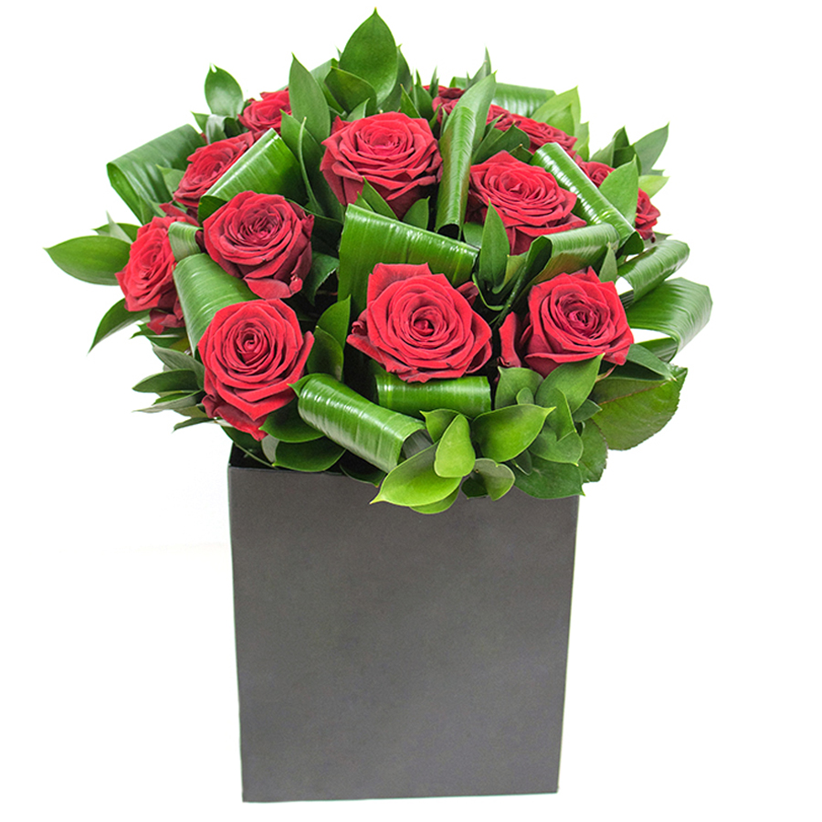 Our timeless red rose bouquet features a beautiful combination of vibrant red roses, rich aspidistra leaves, and delicate ruscus. This exquisite arrangement is crafted to bring elegance and charm to any home or special occasion.