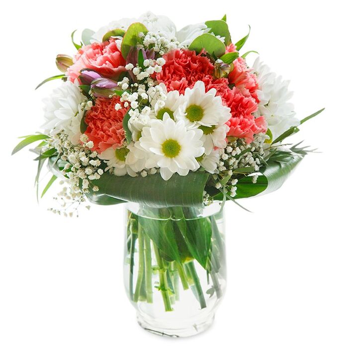 There's a gentle joy radiating from this Blackfriars bouquet-a moment of spring gathered with skill and care. Inside the clean lines of a white square gift bag, coral and red carnations bloom exuberantly, their ruffled petals almost glowing in the light, evoking the warmth of afternoon sun by the Thames. Bright white daisies with fresh green centers add an easy, cheerful spirit, setting a playful tone that feels at home near the city's leafy corners and riverside paths. Inspired by the possibility that flourishes in every London day, delicate baby's breath is woven throughout, its tiny white clusters adding softness and a touch of innocence. Along one edge, the surprise of closed purple buds offers quiet intrigue-a promise of what's yet to flower. Rich, glossy green leaves envelope the arrangement, holding everything together in an embrace of living energy. Against the brilliant white backdrop, each colour and petal stands out-a celebration of simplicity and sophistication. Ready to be delivered across Blackfriars or shared with a friend in Temple, this bouquet is perfect for marking new adventures, birthdays, or just sending a breath of freshness into the heart of the city. This radiant bouquet is a poetic embodiment of Blackfriars' vibrant soul, marrying natural beauty with expert craftsmanship. Viewed from above, the crisp white petals of daisies gleam with purity, encircling lime-green centres that seem to pulse with city energy. Plush, coral-pink carnations spill outward, their gently ruffled petals creating a layered warmth evocative of summer afternoons in Blackfriars' riverside gardens. Wisps of ethereal baby's breath cascade throughout the bouquet, the delicate white clusters lending a weightless, star-like effect reminiscent of the illumination at Festival Pier after dusk. Sprigs of eucalyptus and glossy deep-green foliage form a tranquil, grounding base, while subtle hints of purple-edged alstroemeria promise new beginnings. Carefully composed, the bouquet's circular form conveys intentionality and welcome-a fresh, joyful accent suited for celebrating special occasions, expressing encouragement, or simply bringing a note of brightness to offices or residences along Farringdon and beyond. Every petal and leaf echoes local expertise, ensuring the arrangement feels as authentic and vibrant as Blackfriars itself. The spirit of Blackfriars is captured in this uplifting bouquet, displayed in a gleaming glass vase against pure white surroundings-the sort of arrangement that effortlessly brightens city apartments or offices overlooking the Thames. Fluffy, coral-pink carnations form the vibrant heart, their abundant petals radiating warmth and an understated sophistication. Nestled around them, luminous white chrysanthemums and classic white daisies with sparkling green-gold centers add energy and charm reminiscent of the local riverside gardens dotted along the Embankment. Ethereal clouds of white baby's breath meander through the bouquet, softening edges and creating a cloud-like lightness. A subtle surprise awaits in the form of several closed magenta alstroemeria buds to one side, hinting gently at the joy of blooms yet to unfurl. Robust green leaves-both broad and slim-encircle the base, framing the blossoms and reinforcing a sense of natural abundance. Crisply visible stems bask in clear water, heightening the impression of just-picked freshness. The bouquet is balanced and inviting, expertly arranged for moments of celebration, comfort, or thank you gestures. Each detail reveals the thought and artistry of Blackfriars' dedicated florists, with every flower carefully chosen to evoke wellbeing and delight in the heart of this historic neighbourhood.